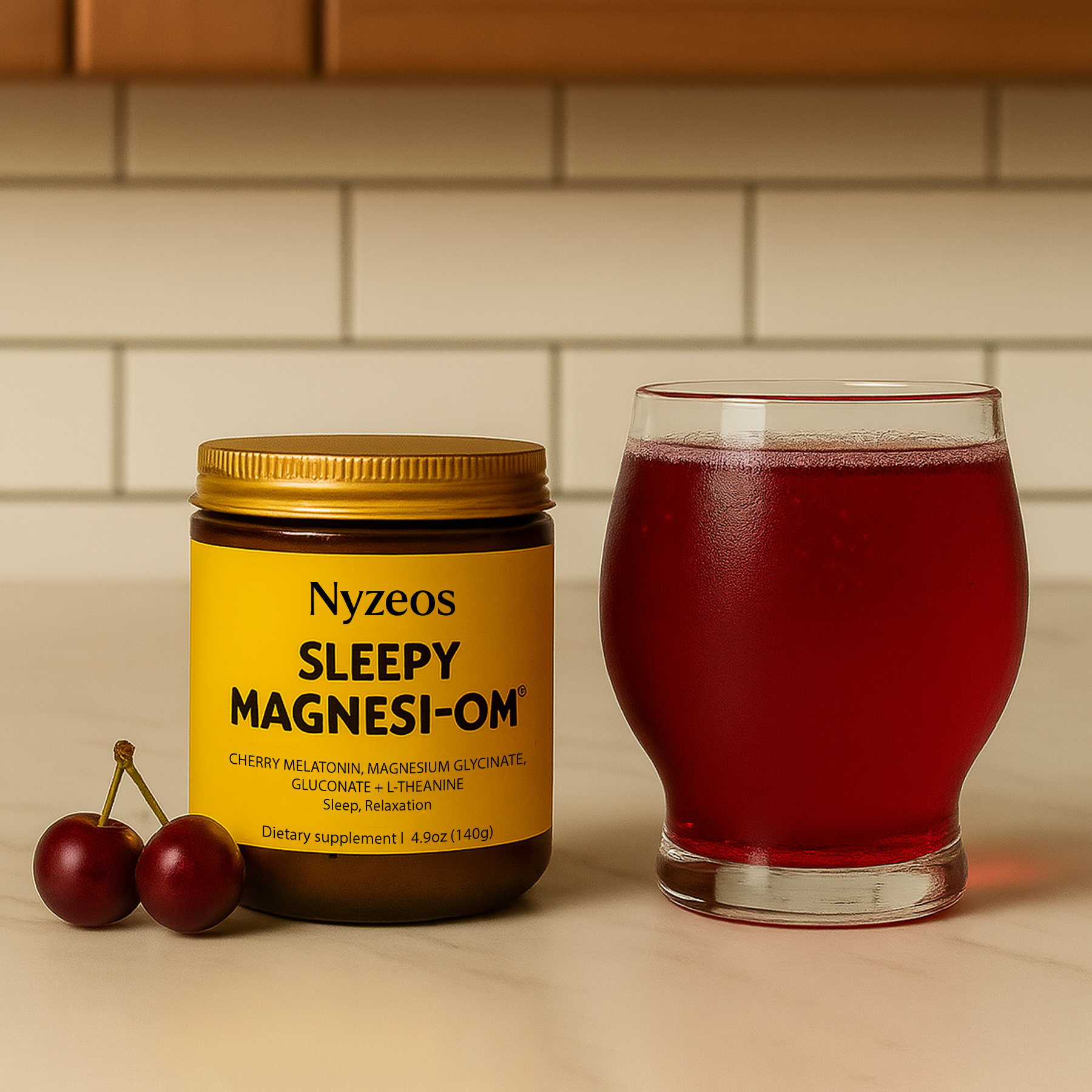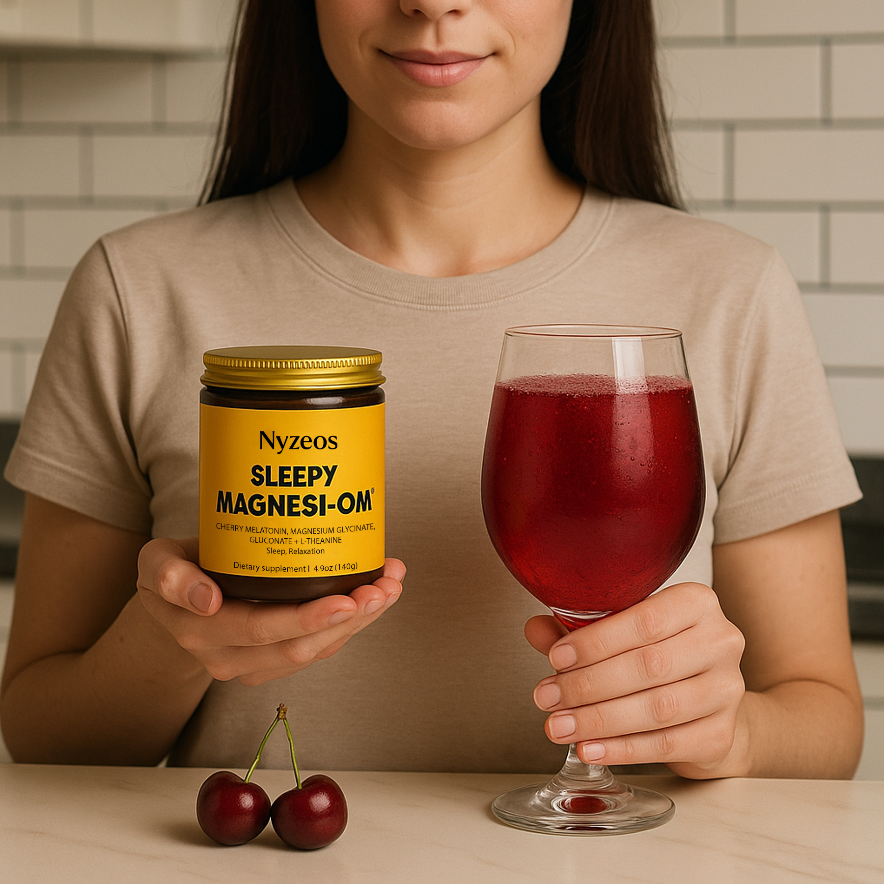 Mix 1 tsp of our magnesium powder in water every night or when you need to chill. Or mix one serving size with Tart Cherry Juice + sparkling water to make your own Sleepy Girl Mocktail.